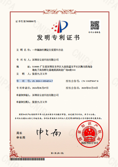 3月18日消息,深圳市安盈科技有限公司收到由中華人民共和國國家知識產(chǎn)權(quán)局頒發(fā)的一項《發(fā)明專利證書》,安盈科技自主研發(fā)的漏油監(jiān)測系統(tǒng)——“一種漏油檢測定位裝置和方法”榮獲國家發(fā)明專利,專利號:ZL 2024 1 0554214.7。這一成果標志著安盈科技在工業(yè)安全監(jiān)測技術(shù)領(lǐng)域的領(lǐng)先地位,也為行業(yè)漏液監(jiān)測提供了創(chuàng)新解決方案。...